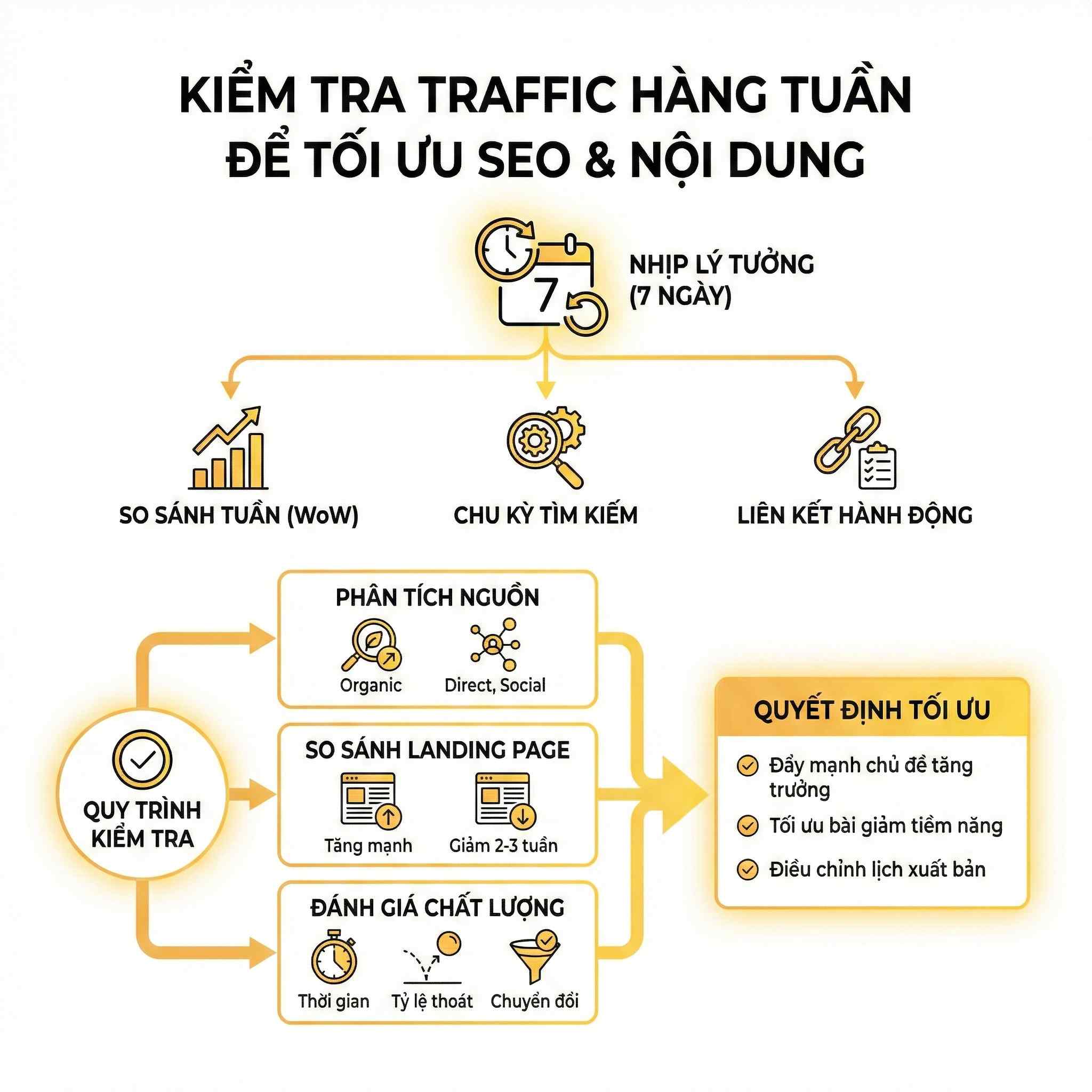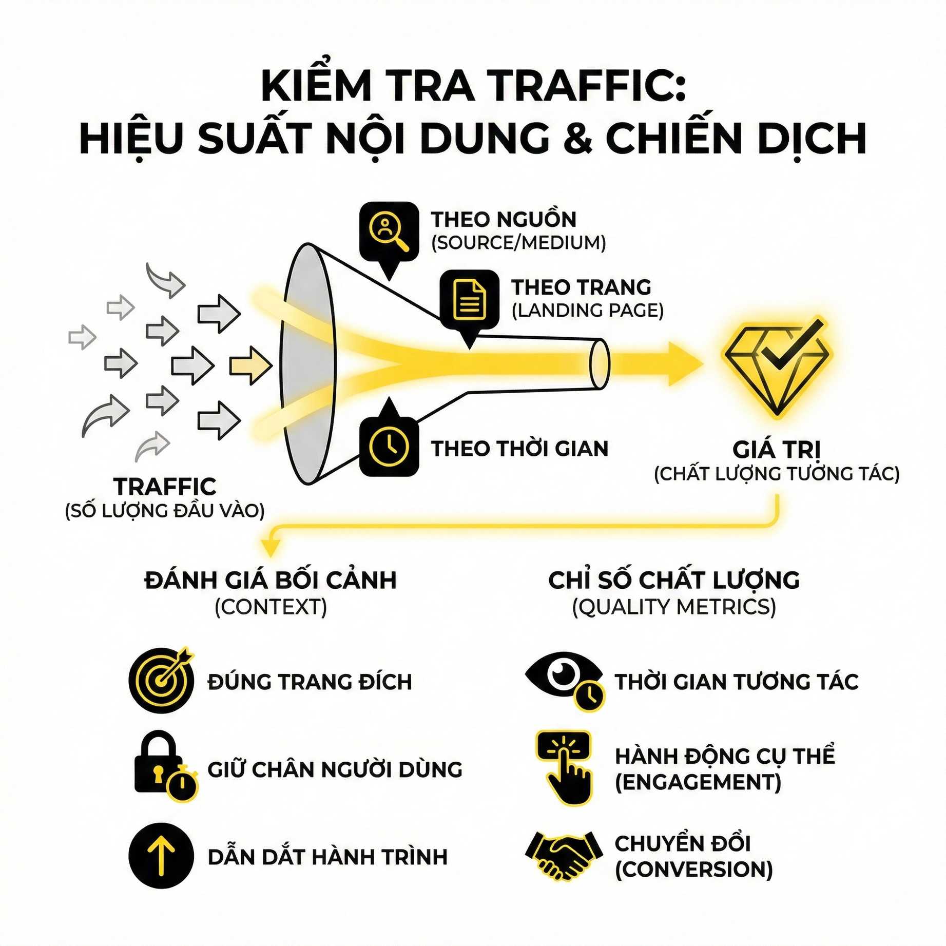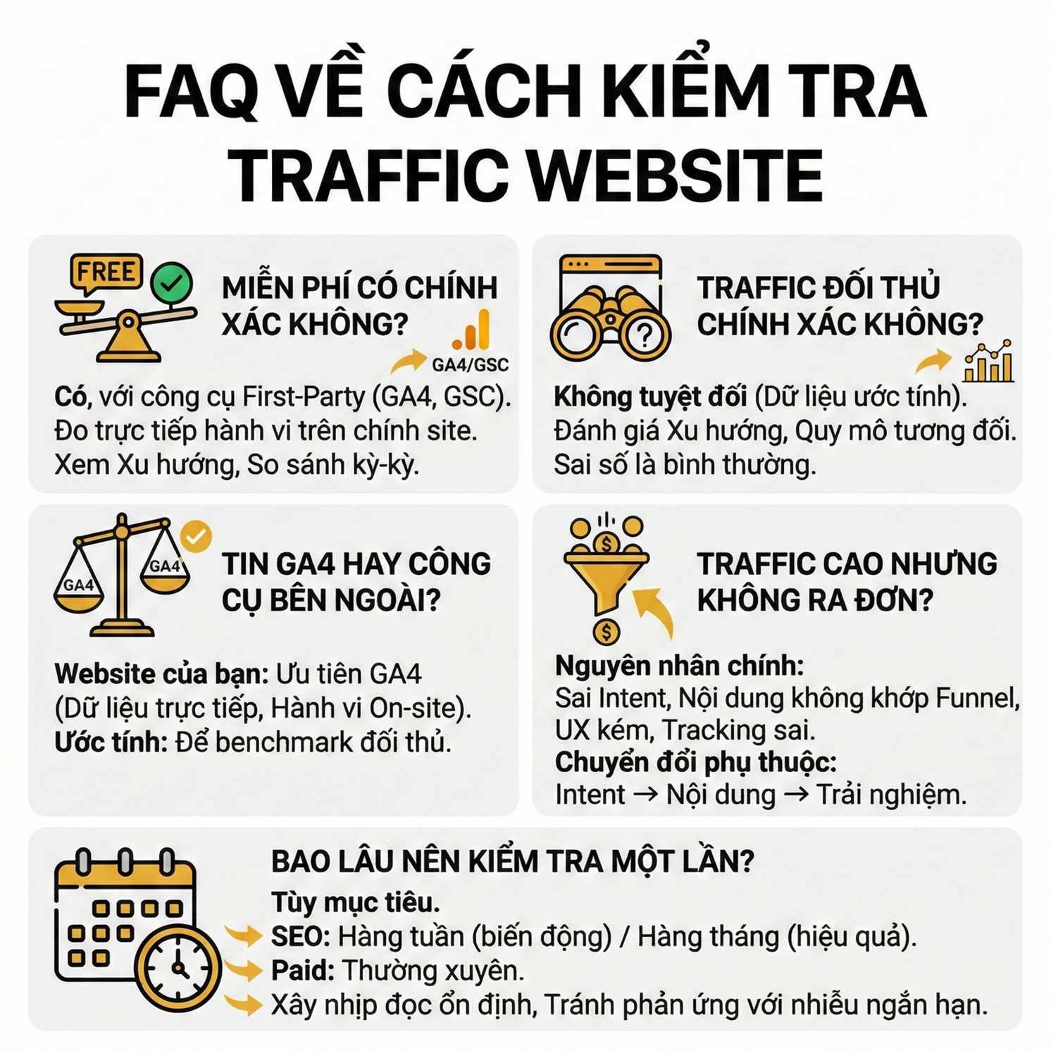Checklist dưới đây không nhằm giúp bạn “xem cho biết”, mà giúp bạn đọc traffic như một hệ thống, hiểu được nguồn gốc, chất lượng và tác động thực sự của traffic lên kết quả cuối cùng.
