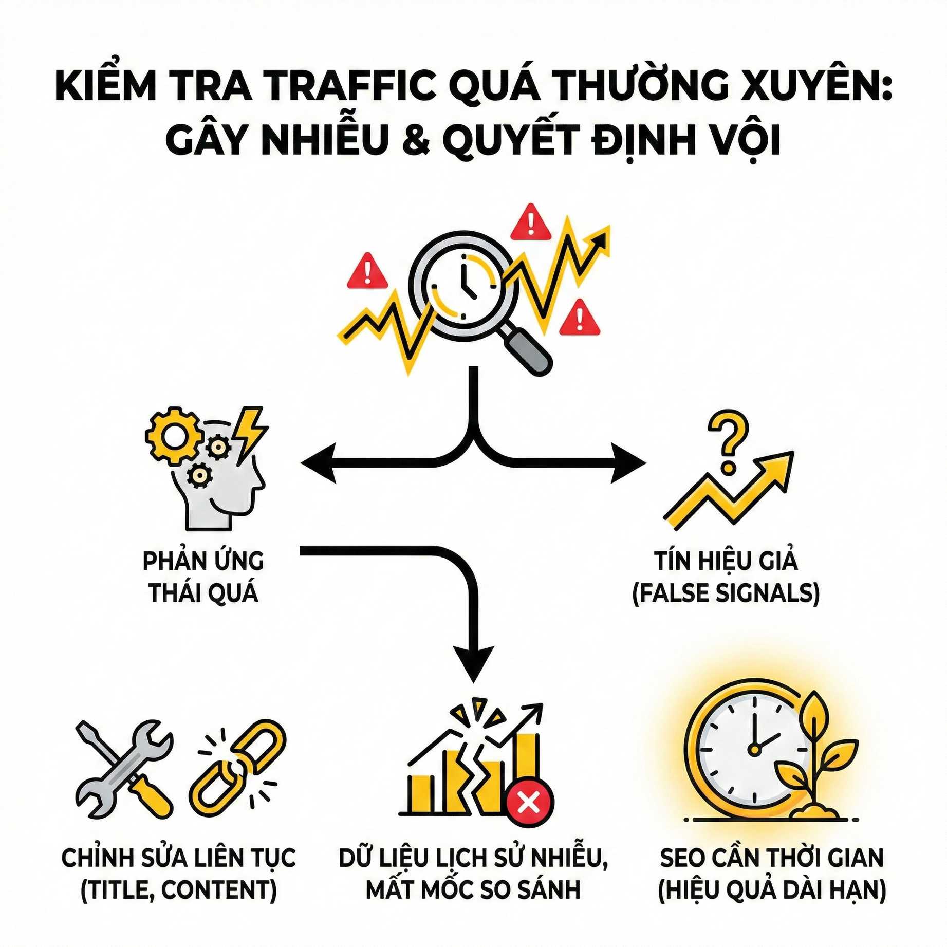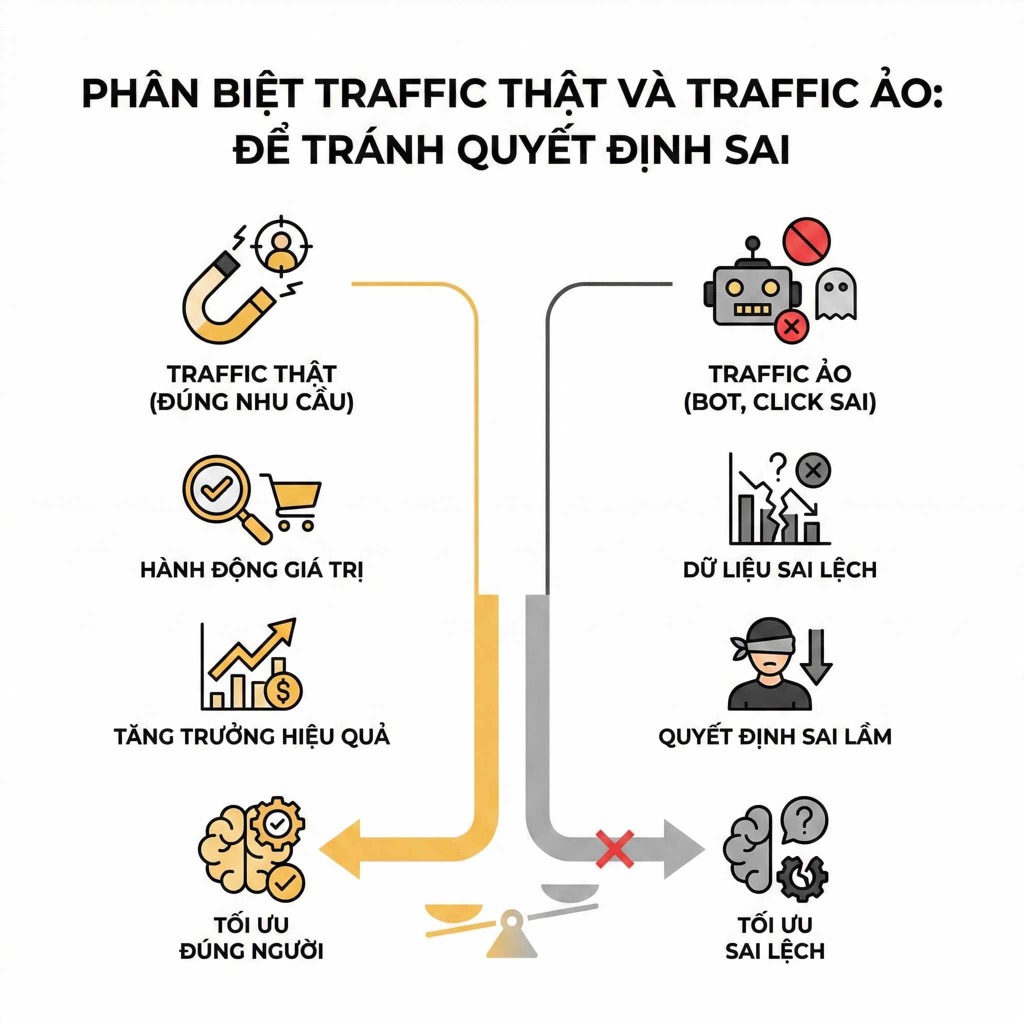 Đây là sai lầm mang tính “hệ thống”, thường xuất hiện ở cả marketer lẫn chủ doanh nghiệp. Tổng traffic tăng thường tạo cảm giác an toàn và thành công, nhưng thực tế có thể là một tín hiệu cảnh báo.