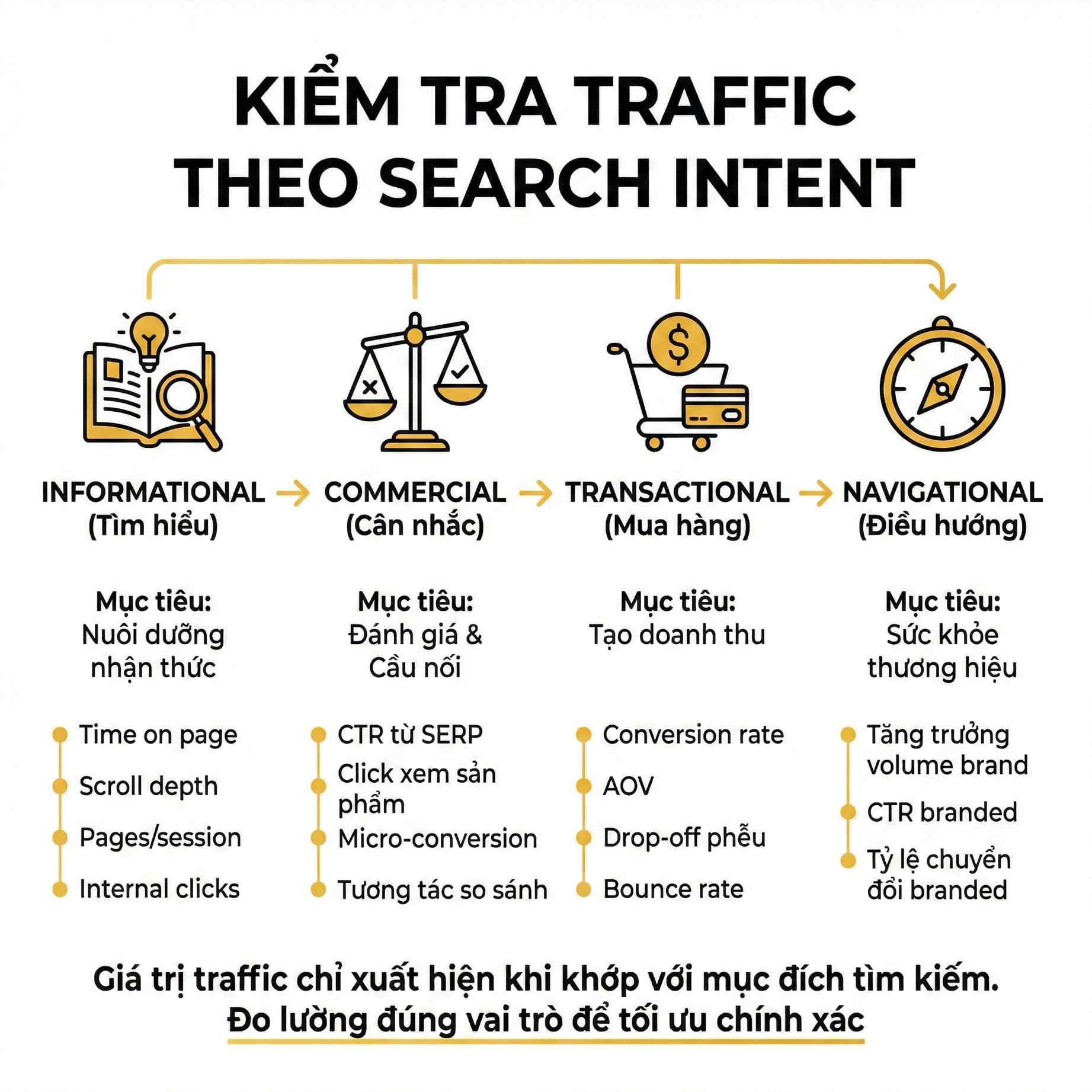 Một website phát triển bền vững thường có sự cân bằng giữa các nhóm intent này, thay vì chỉ tập trung vào một loại traffic duy nhất.