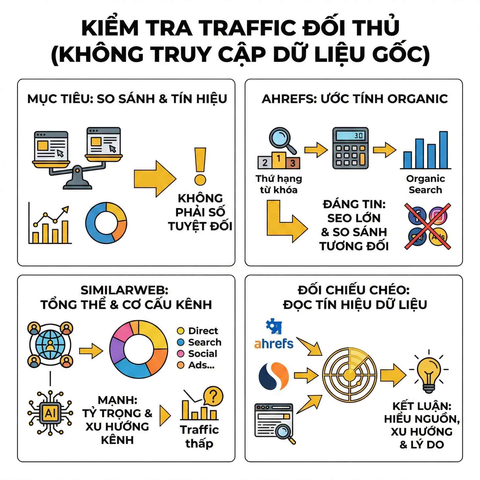 Phân tích traffic đối thủ không nhằm tìm con số chính xác tuyệt đối, vì không có công cụ nào cung cấp dữ liệu 100% đúng. Mục tiêu thực sự là hiểu xu hướng, chiến lược và lợi thế cạnh tranh của đối thủ trên mặt trận traffic.
