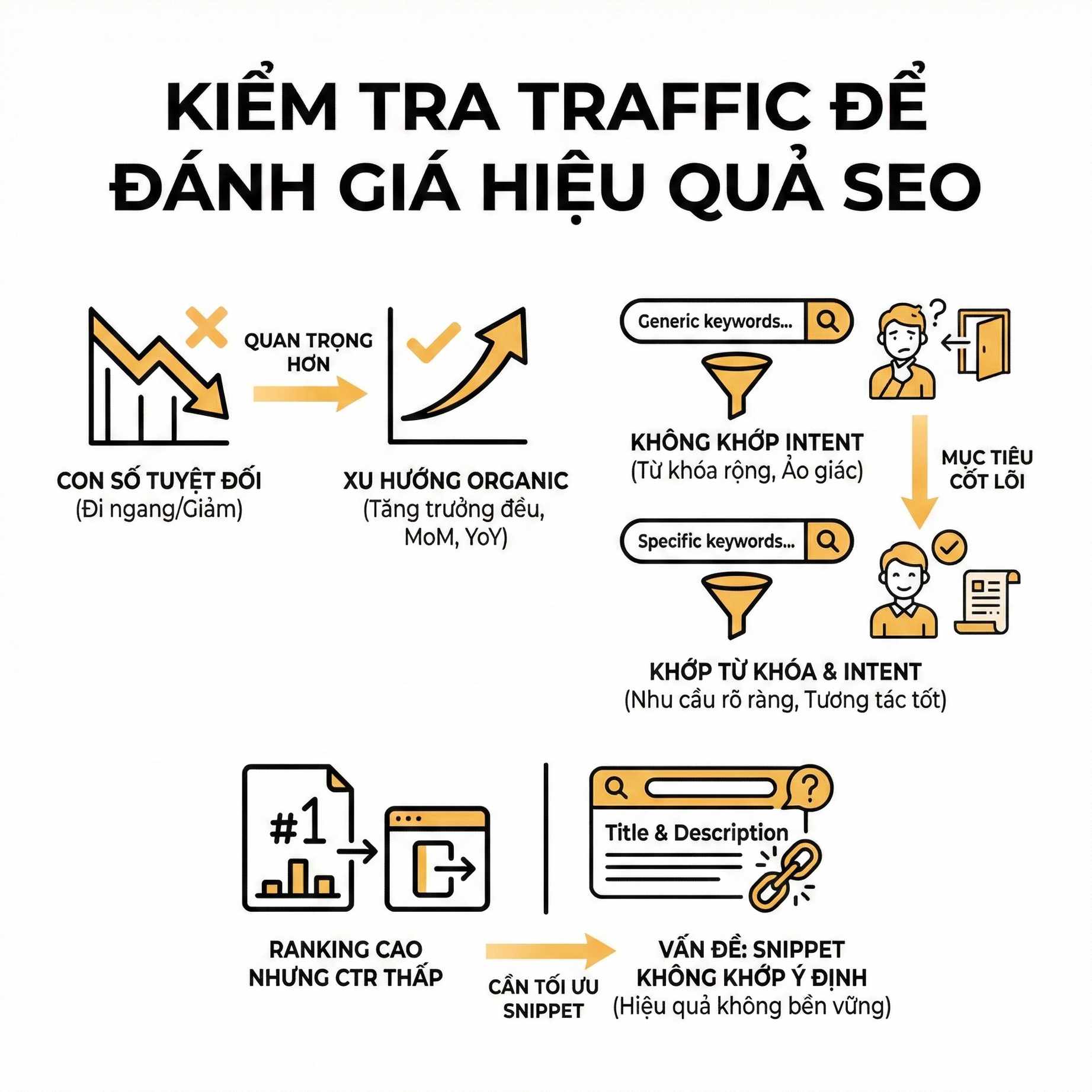 Nếu không phân tích intent, việc kết luận “traffic tăng = hiệu quả tốt” là một ngộ nhận nguy hiểm. Trong nhiều trường hợp, traffic tăng nhưng tỷ lệ chuyển đổi giảm mạnh, thời gian on-site thấp và bounce rate cao chính là dấu hiệu cho thấy chiến lược đang đi lệch hướng.