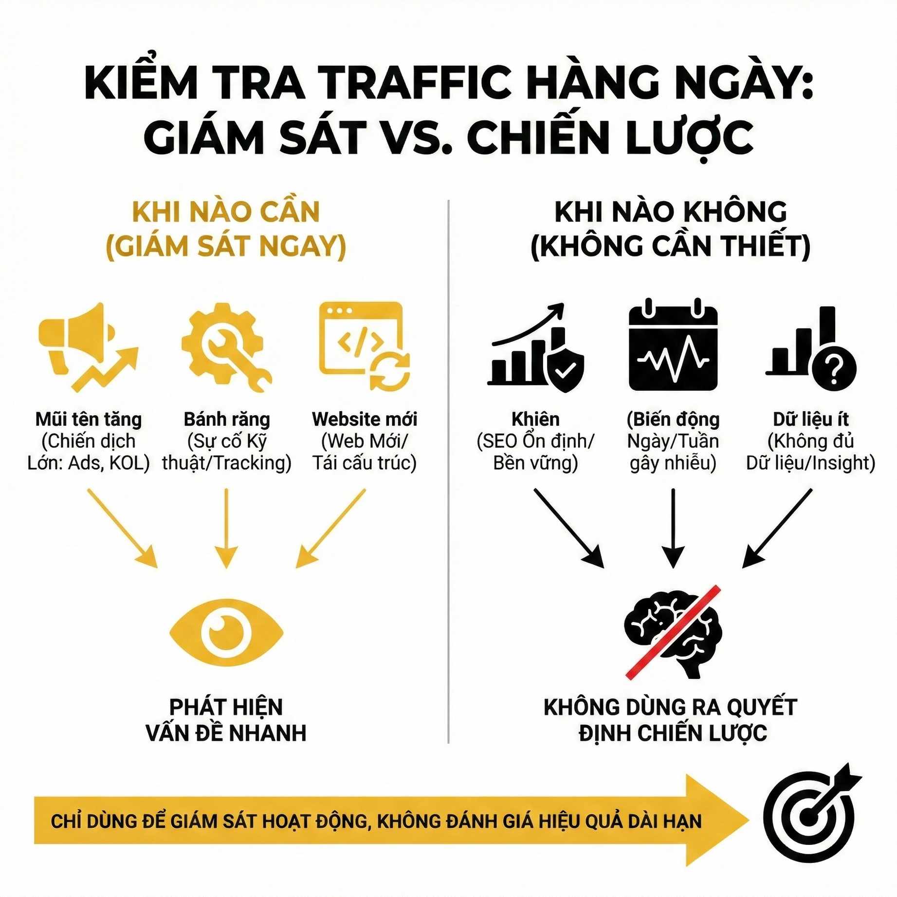 Trong phân tích chuyên sâu, traffic chỉ nên được xem như tín hiệu chẩn đoán, giúp hiểu hành vi người dùng, đánh giá kênh và tối ưu trải nghiệm. Việc tôn sùng traffic như KPI chính là biểu hiện của tư duy đo lường nông, thiếu gắn kết với mục tiêu kinh doanh thực tế.