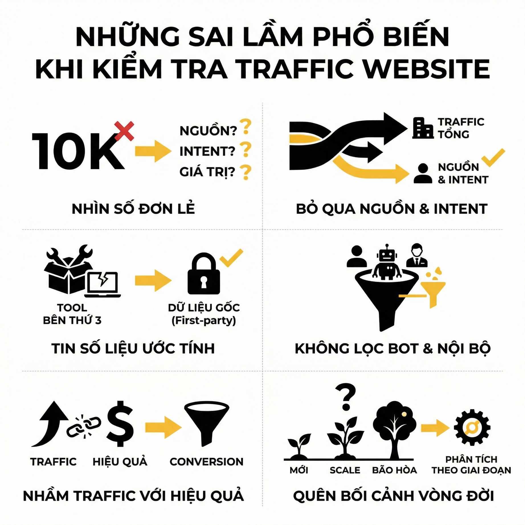 Một sai lầm ngầm khác là đánh đồng traffic với hiệu quả marketing hoặc tăng trưởng kinh doanh. Traffic chỉ là điểm khởi đầu của phễu, không phải kết quả cuối cùng. Nếu không gắn traffic với các chỉ số downstream như: