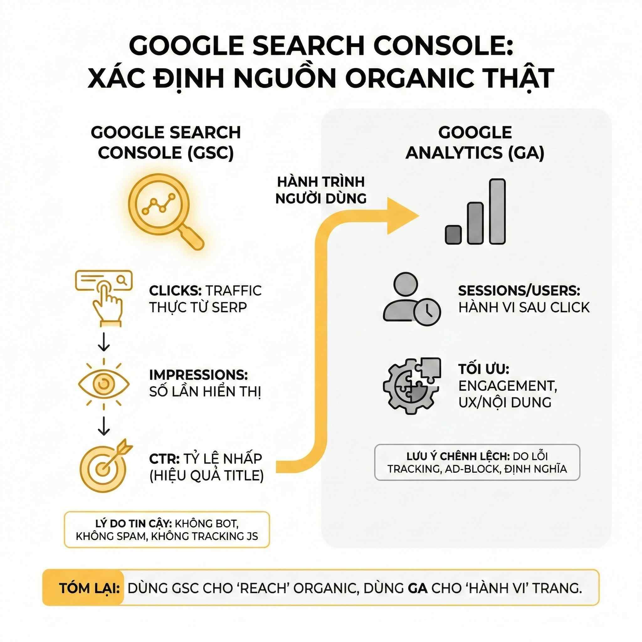 Vì vậy, có thể coi Search Console phản ánh tốt hơn “organic reach từ Google Search” (ai đã click từ SERP), còn Analytics hữu ích hơn để đánh giá “hành vi sau khi vào trang” (engagement, chuyển đổi). Cách dùng thực tế: dùng GSC để theo dõi hiệu suất truy vấn/CTR, và dùng GA để tối ưu nội dung/UX theo hành vi.