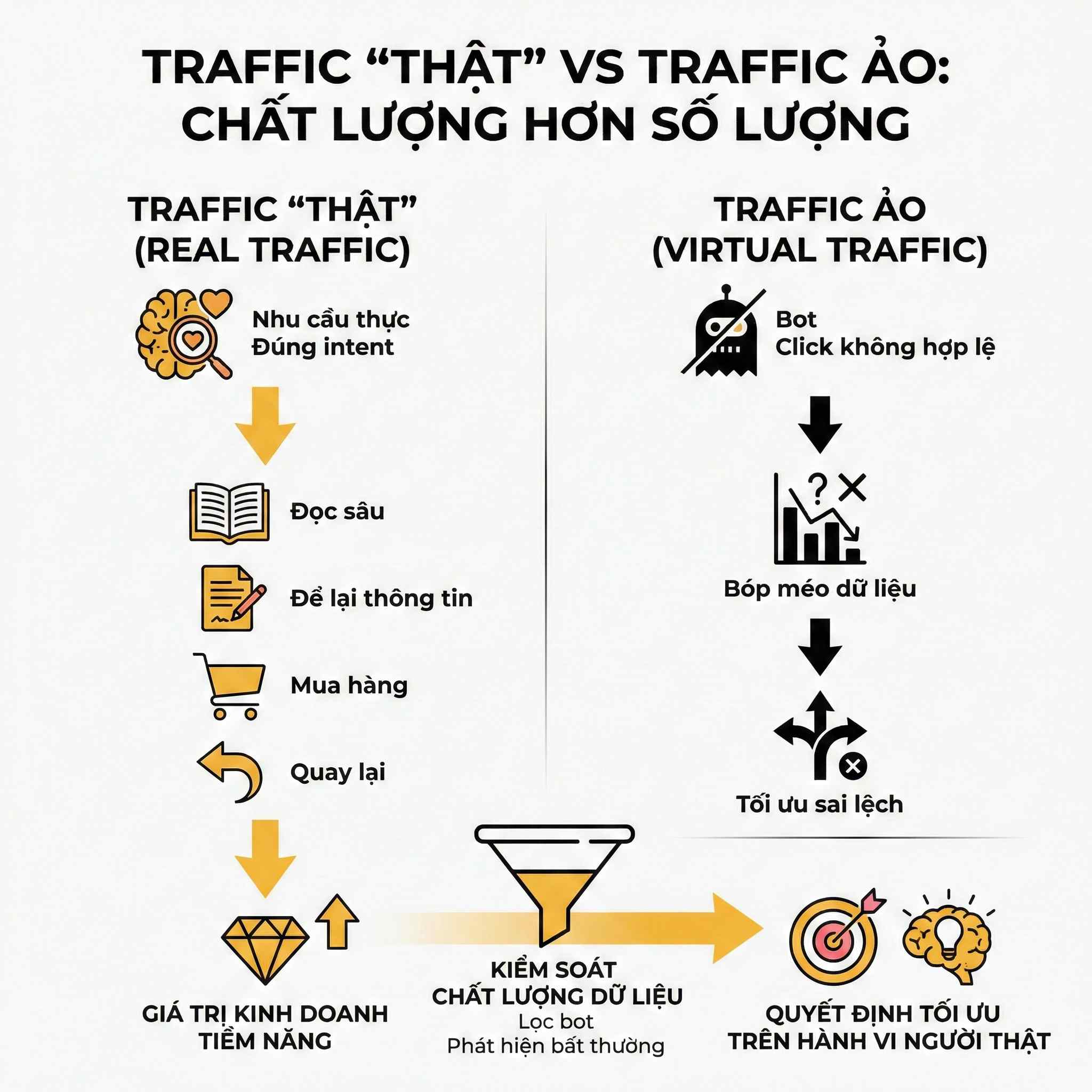 Đánh giá chất lượng traffic là bước phân biệt rõ nhất giữa việc “xem số” và “phân tích marketing”. Traffic chất lượng không phải là traffic đông, mà là traffic đúng người, đúng nhu cầu, đúng thời điểm.