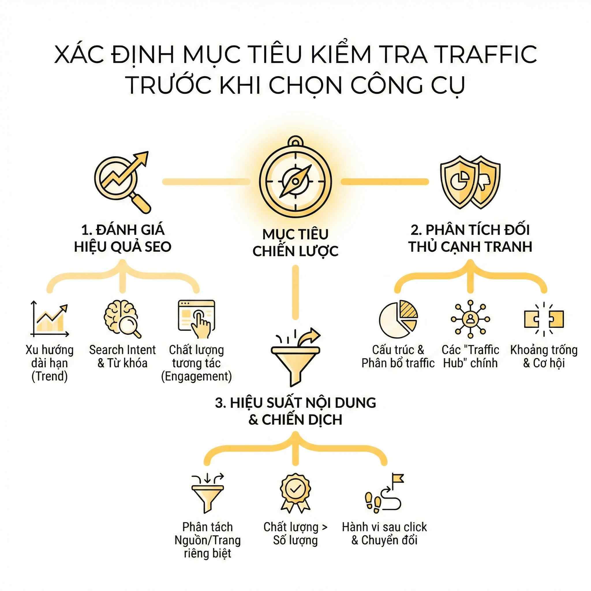 Bước đầu tiên khi kiểm tra traffic không phải mở công cụ đo lường, mà là xác định rõ mục tiêu kiểm tra. Mỗi mục tiêu sẽ quyết định cách bạn đọc dữ liệu. Ví dụ, kiểm tra để đánh giá SEO sẽ khác hoàn toàn với kiểm tra để tối ưu conversion hoặc đánh giá hiệu quả chiến dịch quảng cáo.